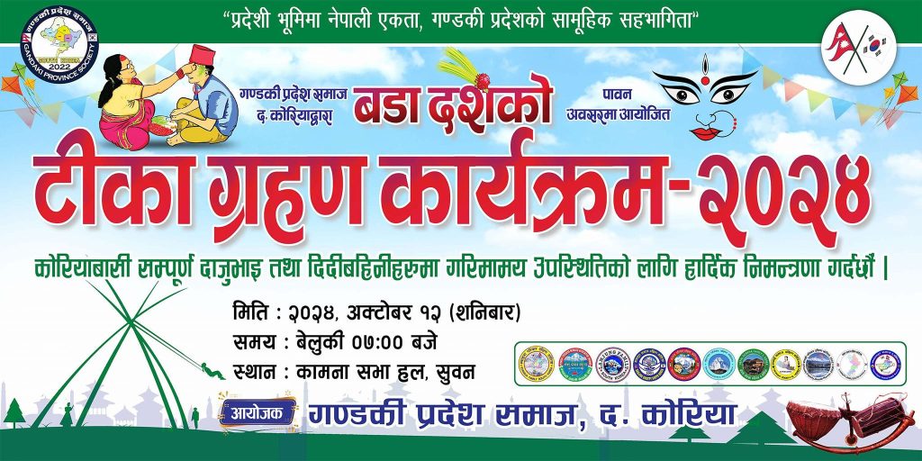 नपाली संस्कृतिको संरक्षण तथा प्रवर्द्धन गरी एक आपसमा माया, सद्भाव बढाएर भाइचारा कायम राख्नुको साथै स्वदेशको पारिवारिक झल्को मेटाउने उद्देश्यले गण्डकी प्रदेश समाज दक्षिण कोरियाको आयोजना र प्रदेश समाज अन्तर्गत रहेका ११ जिल्लाहरूको समन्वयमा दशैंको अवसरमा भेटघाट, टीकाजमरा ग्रहण तथा शुभकामना आदानप्रदान कार्यक्रम आयोजना गर्न लागिएको समाजका अध्यक्ष प्रबिन गिरीले बताएका छन् ।