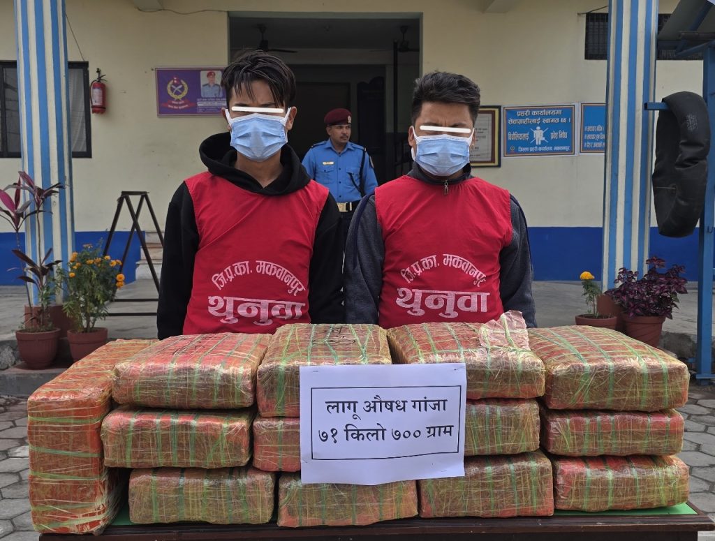 हेटौडा उपमहानगरपालिका वडा नंबर–१९ तिनताप्के स्थित पुर्व पश्चिम लोकमार्ग सडकखण्डमा प्रहरीले लागुऔषध गाँजा सहित मकवानपुर राक्सीराङ गाउँपालिका वडा नंबर– ९ बस्ने २० वर्षिय मिलन घलान र सोही गाडीमा सवार सोही स्थानका २६ वर्षिय दावा थिङलाई पक्राउ गरेको हो । मनहरीबाट हेटौडातर्फ जादै गरेको प्रदेश ३–०१–०२४ च ३०५९ नंबरको पिकअप गाडीलाई रोकी चेकजाँच गर्ने क्रममा ७१ किलो ७ सय ग्राम लागूऔषध गाँजा फेला परेको थियो । पिकअप गाडी सहित घलान र थिङलाई नियन्त्रणमा लिई थप अनुसन्धान कार्य भईरहेको जिल्ला प्रहरी कार्यालय मकवानपुरका प्रहरी नायब उपरिक्षक स्यामु अर्यालले बताए ।