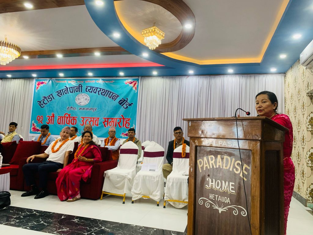 कार्यक्रमलाई सम्बोधन गर्दै प्रमुख अतिथि लामाले हेटौंडा व्यवस्थापन बोर्डले शुद्ध खाने पानी वितरण गर्दै आएको बताउनु भयो । हेटौंडा उपहानगरपालिकाले न्युनतम शुल्क तिरिसकेपछि विभिन्न वडाबाट जोड्ने काम भईरहेको बताउनु भयो । ५० बर्षको योजना , प्रदेश सरकार र स्थानिय सरकार डिपिआर फाईन्डआउट गरेर टेन्डरको चरणमा पुगेको बताउनु भयो । यसै गरी उहाँले खाने पानी व्यस्थापनका कर्मचारीलाई अझ जिम्मेवारी पुर्वक काम गर्न आग्रह गर्नु भयो । उहाँले खानेपानी बोर्ड असफल हुनु भनेको सरकार असफल हुनु हो ।