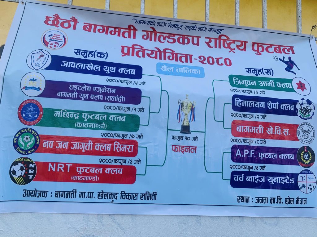 हेटौंडा/ मकवानपुर जिल्लाको बागमति गाउँपालिकामा बागमति छैठौं गोल्ड कप हुदै छ । खेलकुद विकास समिति बागमति गाउँपालिका समिति द्धारा आयोजना हुने प्रतियोगिता फागुन १ गते देखि १० गते सम्म चल्ने आयोजक समितिले आईतबार पत्रकार सम्मेलन गर्दै जानकारी दिएको हो ।