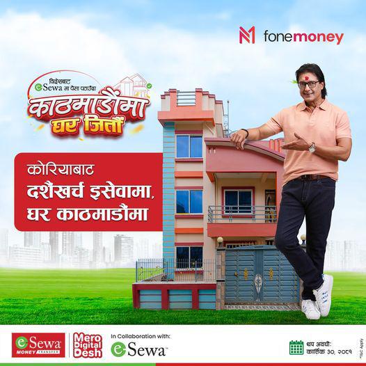 दशैं तिहारको उपलक्ष्यमा काठ्माण्डौंमा घर जित्ने मौका कार्तिक ३० गते सम्म रहने कम्पनिले जनाएको छ । इसेवा मनी ट्रान्सफरका ब्रान्ड एम्बेस्डर राजेश हमालले एक कार्यक्रम बिच घर भने सार्वजनिक गरिसकेका छन् ।