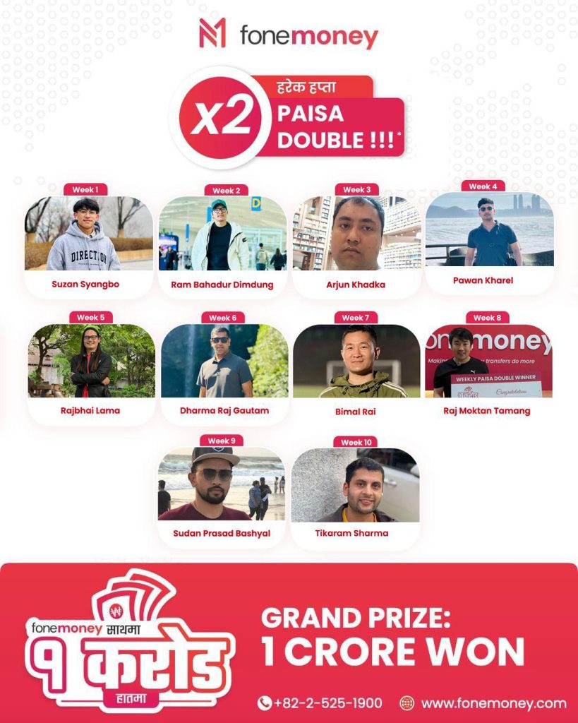 फोन मनि को हरेक हप्ता पैसा डबल योजना अन्र्तगत टिकाराम शर्मा वीक्ली पैसा डबलको १० औ विजेता बनेका छन । गत साता सुदन प्रसाद बस्याल ९ औँ विजेता , ८ औं हप्ताका विजेता राज मोक्तान तामांग सातौ हप्तामा बिमल राई विजेता बनेका थिए । हालसम्म १० औ हप्तासम्म फोनमनीले साप्ताहिक बिजेता चयन गरि सकेको छ । १ करोडको योजना रहेको २०२४ वर्षभरि साप्ताहिक फोनमनीको वीक्ली पैसा डबल योजना रहने कम्पनीले जनाएको छ । हरेक साता सोमबारबाट आइतबार सम्म पैसा पठाउने मध्येबाट १ जना विजेता बन्न सक्नेछन ।