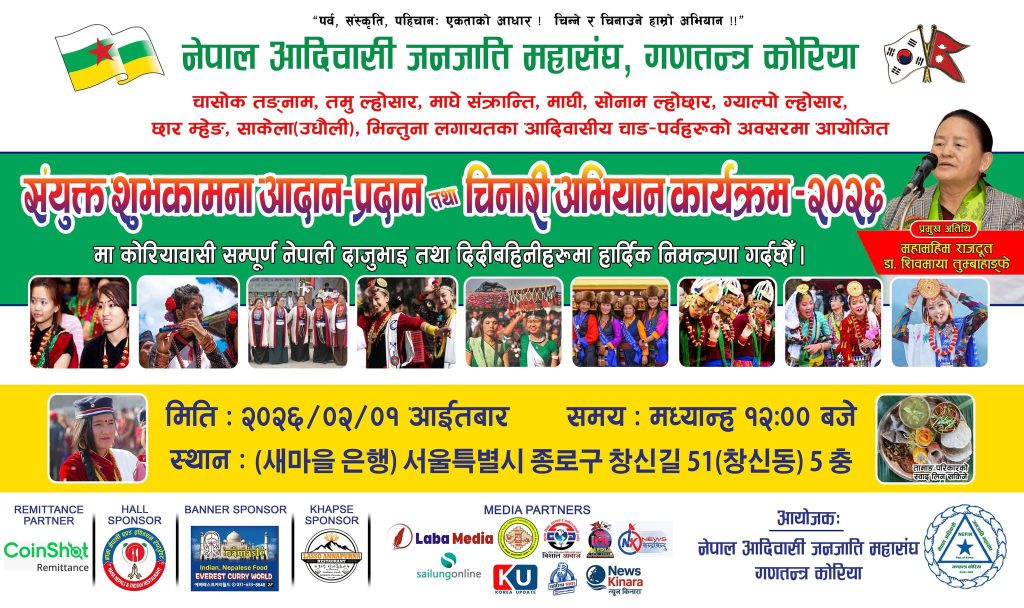 आगामी फेब्रुअरी १ तारिख का दिन “पर्व, संस्कृति, एकताको आधार ! चिन्ने र चिनाउने हाम्रो अभियान” भन्ने मूल नाराका साथ आयोजना हुने उक्त कार्यक्रमको तयारी लगभग पूरा भएको महासङ्घका अध्यक्ष शुभराज भोम्जन ले जानकारी दिएका छन्। महामहिम राजदूत डा. शिवमाया तुम्बाहाङ्फेको प्रमुख आतिथ्यतामा सम्पन्न हुने कार्यक्रममा शुभकामना आदान–प्रदानका साथै मौलिक परिकार, आदिवासी चाडपर्व तथा संस्कृतिबारे विभिन्न जातीय संस्थाका अध्यक्षहरूले आ–आफ्ना धारणा प्रस्तुत गर्ने कार्यक्रम रहेको छ। महासङ्घको ९औँ कार्यसमितिको पहिलो कार्यक्रमका रूपमा आयोजना हुन लागेको यस कार्यक्रममा कोरियावासी सम्पूर्ण नेपालीहरूलाई सक्रिय सहभागिताका लागि आयोजकले आह्वान गरेको छ।